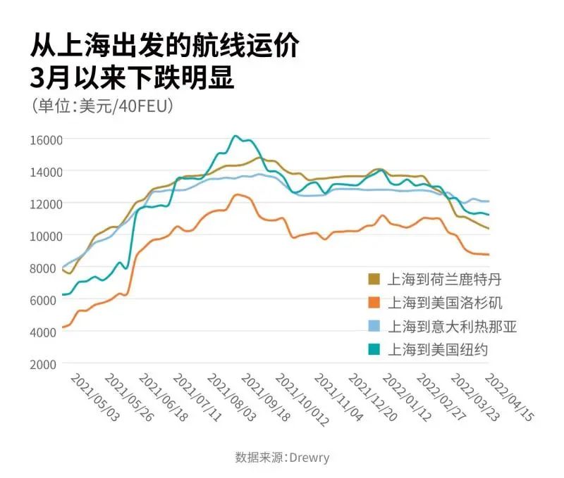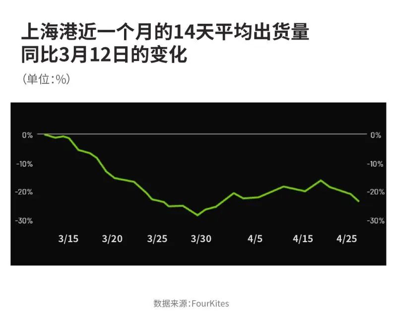 种种因素的结果便是,能够输出的货物量减少了。根据供应链实时监测平台FourKites的数据,4月15日,上海港的14天平均海上出货量相比上一月下降了20%以上。