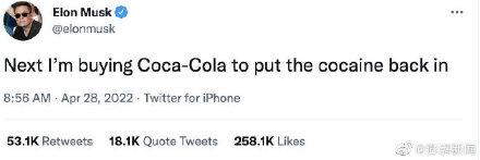 北京时间4月28日消息,马斯克发推文称,“接下来我要收购可口可乐公司,再把可卡因重新加进去。”