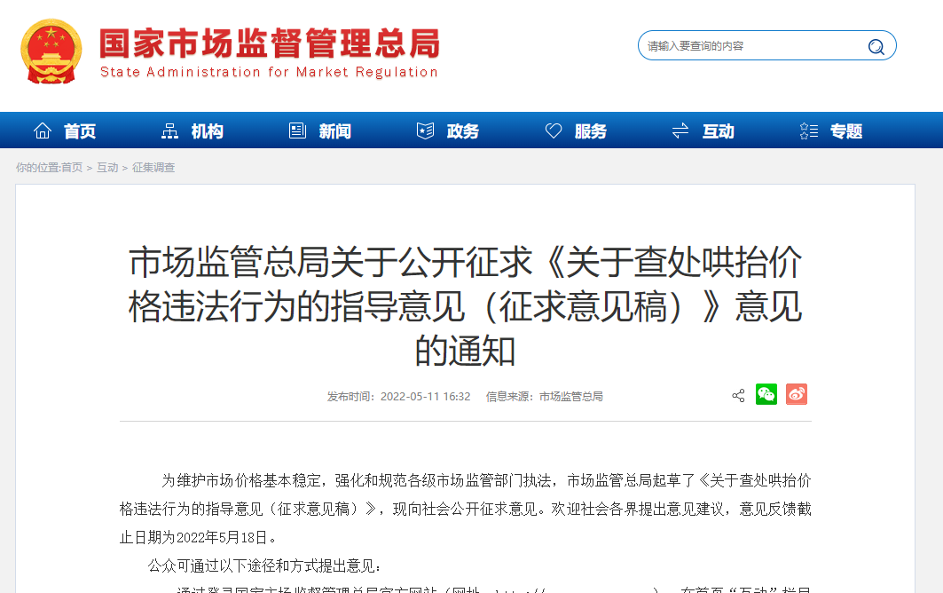 5月11日下午,市场监管总局网站发布通知,将起草的《关于查处哄抬价格违法行为的指导意见(征求意见稿)》(以下简称《征求意见稿》)向社会公开征求意见,征集期为5月11日至5月18日。
