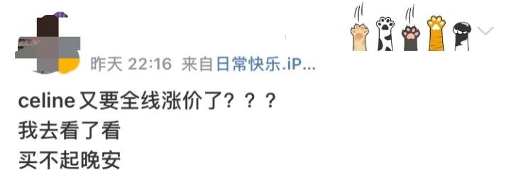 以目前已公开的涨价品牌来看,珠宝腕表是主要品类,而其中主打手袋、配饰等皮具产品的Celine,则成了这一波涨价消息中的“亮点”——除了是这波涨价中的第一位,还有一个原因:距离Celine上一回涨价,才过了3个月。
