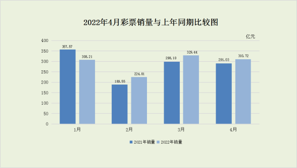 4月份,全国共销售彩票310.72亿元*,同比增加19.69亿元,增长6.8%。其中,福利彩票机构销售119.70亿元,同比增加8.05亿元,增长7.2%;体育彩票机构销售191.02亿元,同比增加11.64亿元,增长6.5%。
