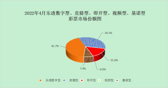 4月份,乐透数字型彩票销售132.65亿元,同比增加1.59亿元,增长1.2%;竞猜型彩票销售106.65亿元,同比增加10.68亿元,增长11.1%;即开型彩票销售48.55亿元,同比增加0.15亿元,增长0.3%;基诺型彩票销售22.87亿元,同比增加7.27亿元,增长46.7%。4月份,乐透数字型、竞猜型、即开型、基诺型彩票销售量分别占彩票销售总量的42.7%、34.3%、15.6%、7.4%。视频型彩票销售0.0001亿元,同比减少0.0007亿元。