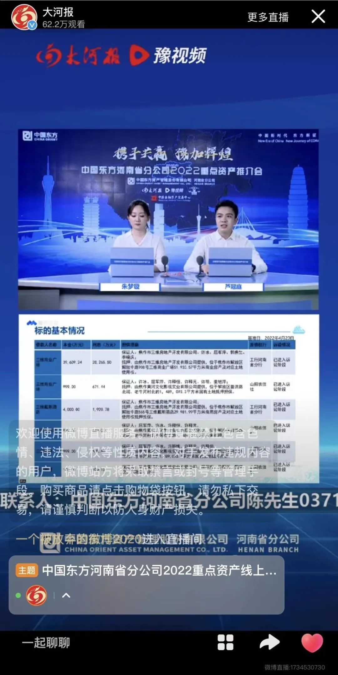 5月31日下午,中国东方资产管理股份有限公司河南省分公司(以下简称“中国东方河南省分公司”)联合河南日报报业集团大河报·豫视频、中原金融资产交易中心(以下简称“中原金交中心”),通过直播电商的形态成功举办“中国东方河南省分公司2022重点资产推介会”。