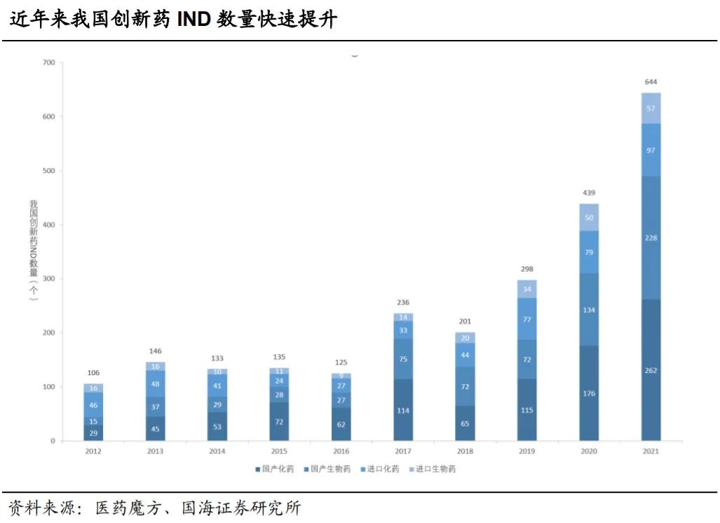 另据医药魔方的公开数据,2012年我国首次提交IND的创新药共106款,2021年则达到了644款,其中,1类生物药IND数量接近250个。