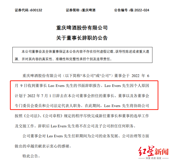 红星资本局6月10日消息,重庆啤酒(600132.SH)发布公告称,公司董事长Leo Evers因个人原因计划于今年7月1日起,辞去董事长、董事以及各董事会专门委员会委员和公司法定代表人职务。