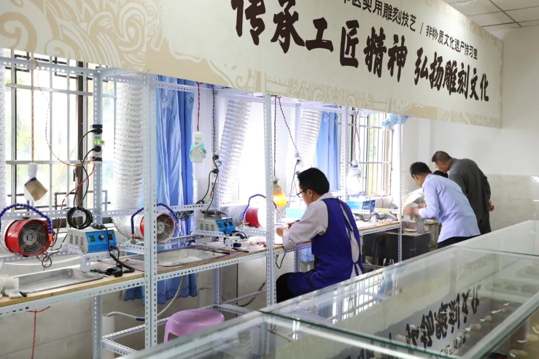 区委常委、宣传部部长杨永芳(右一),区委常委、统战部部长黄丁(左一)为交易市场和建于重庆工商学校内的“潘昭亮雕刻工作室”授牌。