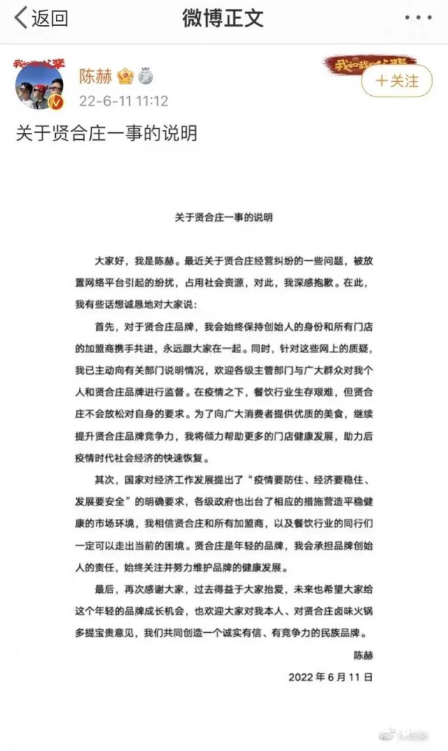 陈赫表示,“对于贤合庄品牌,我会始终保持创始人的身份和所有门店的加盟商携手共进,永远跟大家在一起。同时,针对这些网上的质疑,我已主动向有关部门说明情况,欢迎各级主管部门与广大群众对我个人和贤合庄品牌进行监督。”