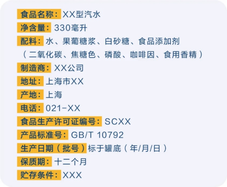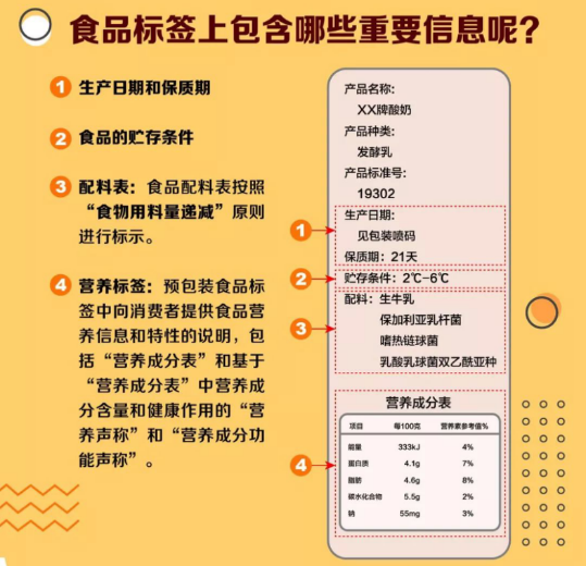 标签包括:食品名称、配料表、净含量和规格、生产者和(或)经销者的名称、地址和联系方式、生产日期和保质期、贮存条件、食品生产许可证编号、产品标准代号及其他需要标示的内容。