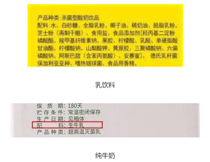 比如牛奶,有的人会将乳饮料、乳酸饮料、乳酸菌饮料当作牛奶。其实标签上产品名称有“饮料、饮品”或类似字样,那这个产品一般为含乳饮料,而不是纯牛奶。