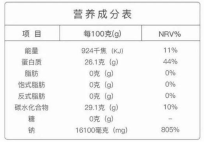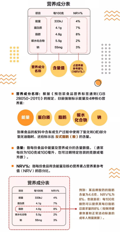 每一种预包装食品营养成分表都必须注明5个基本营养数据,即能量、蛋白质、脂肪、碳水化合物和钠含量,以及这些含量占一日营养供应参考值(NRV)的比例。