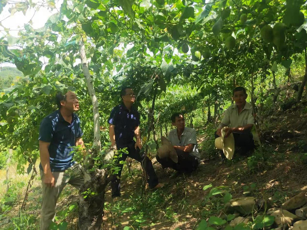 蒋桂荣(左2)经常与种植户一起深入现场查看罗汉果生长情况。(资料图)