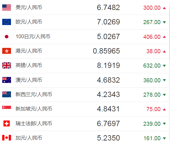 中国人民银行授权中国外汇交易中心公布,2022年6月14日银行间外汇市场人民币汇率中间价为:1美元对人民币6.7482元,1欧元对人民币7.0269元,100日元对人民币5.0267元,1英镑对人民币8.1919元,1澳大利亚元对人民币4.6832元,1新西兰元对人民币4.2343元,1新加坡元对人民币4.8431元,1瑞士法郎对人民币6.7697元,1加拿大元对人民币5.2350元。