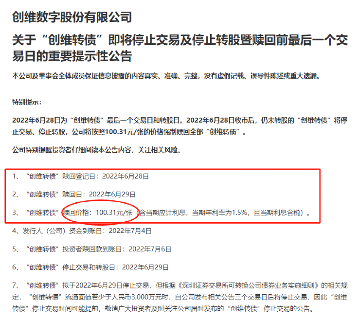 创维数字已连发10次强赎公告提示风险,6月28日最后一个交易日提示。公告称,创维转债的赎回登记日为2022年6月28日,赎回价格为100.31元/张,赎回款发放日和转债摘牌日为2022年6月29日。6月28日收市后,还没有转股的“创维转债”将被全部冻结,并以100.31元/张的价格强制赎回。