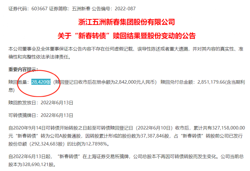 而后新春转债被按照100.323元/张强赎。最后有28420张被强赎回,转债的亏损幅度高达35.4%,投资者总共亏了156.22万元。