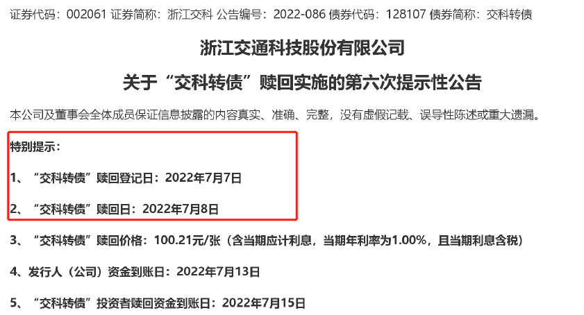 浙江交科6月25日发布了关于“交科转债”赎回实施提示公告,赎回登记日为2022年7月7日,赎回完成后“交科转债”将在深交所摘牌。截至2022年6月27日,交科转债的价格为132.999元/张,如果不及时操作,投资者将面临24.6%的损失。