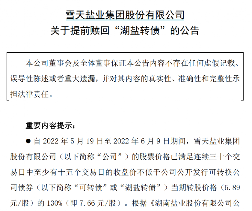 雪天盐业6月10日发布了关于提前赎回“湖盐转债”的公告,赎回登记日为2022年7月9日,强赎价格为100.592元/张,完成赎回后“湖盐转债”将于2022年7月7日在上交所摘牌。截至6月27日,湖盐转债的价格为134.12元/张。