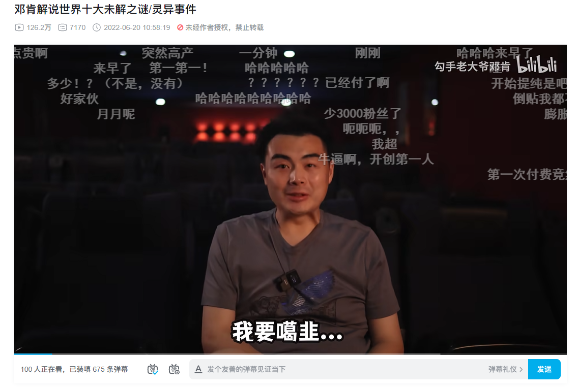6月20日,百万粉丝UP主“勾手老大爷邓肯”(以下简称“邓肯”)投稿两条视频。与往期不同,新视频的画面明显更加专业。UP主介绍称专门包了电影厅,并请了灯光摄影团队。而更加不同以往的是,新视频是收费观看,30块钱10期。