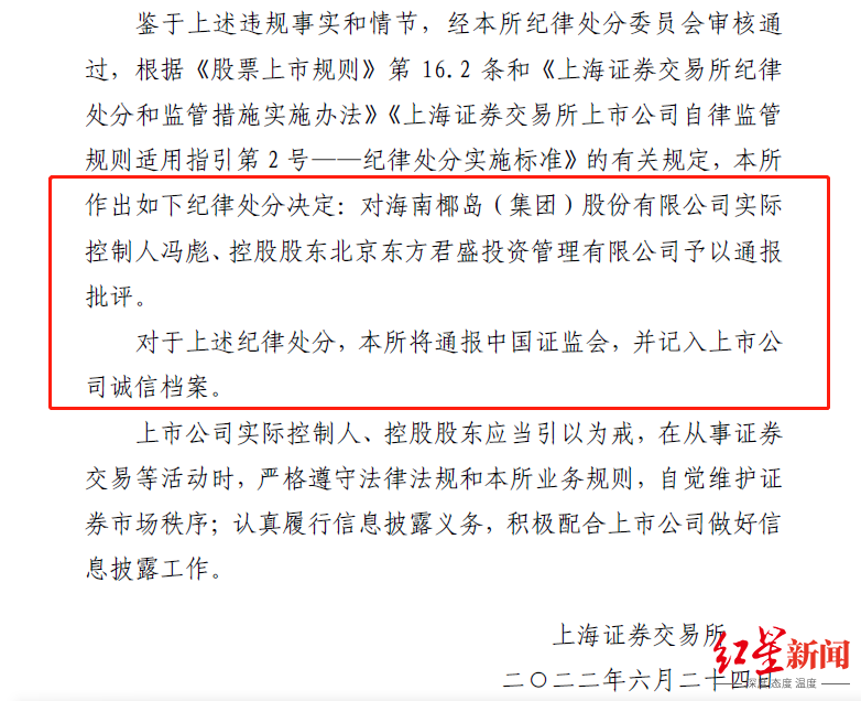 上交所决定,对海南椰岛实际控制人冯彪、控股股东东方君盛予以通报批评。同时,上交所对此次纪律处分将通报中国证监会,并记入上市公司诚信档案。