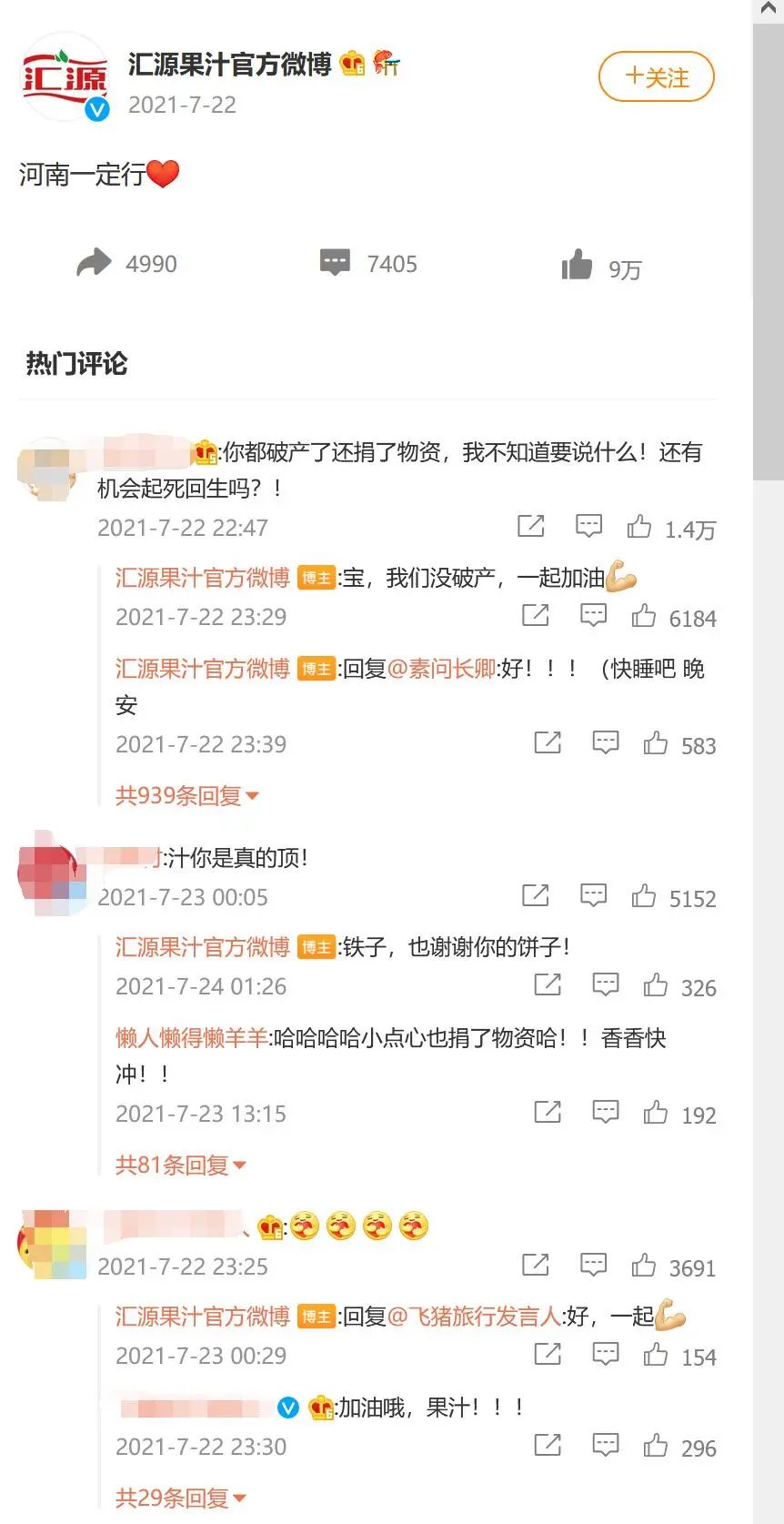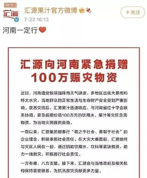 来自汇源果汁的官方微博显示,步履艰难、等待重组的汇源集团,曾在2021年7月为河南捐赠了100万赈灾物资,收获了网友的一致好评。