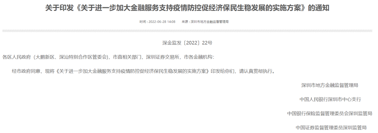 【环球网房产报道】6月28日,深圳市地方金融监督管理局、中国人民银行深圳市中心支行、中国银行保险监督管理委员会深圳监管局、中国证券监督管理委员深圳监管局联合印发《关于进一步加大金融服务支持疫情防控促经济保民生稳发展的实施方案》(以下简称“《方案》”)的通知。