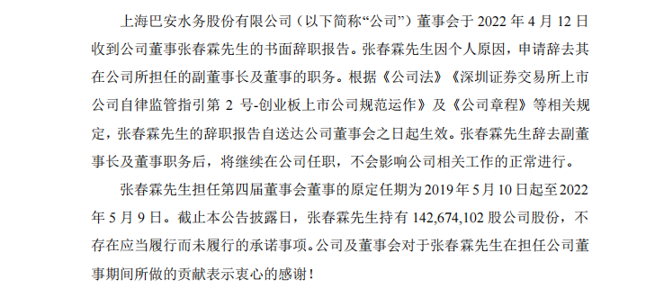 第二次离职,则发生在今年4月中旬——距离巴安水务第四届董事会任期结束不足一个月,张春霖因“个人原因”请辞副董事长及董事职务。