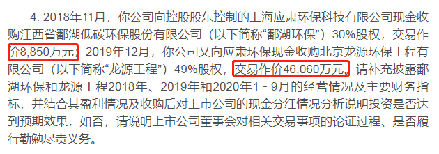 第一笔被问及的关联交易发生在2018年11月。当时,巴安水务向应肃环保现金收购鄱湖环保30%股权,交易作价8850万元。