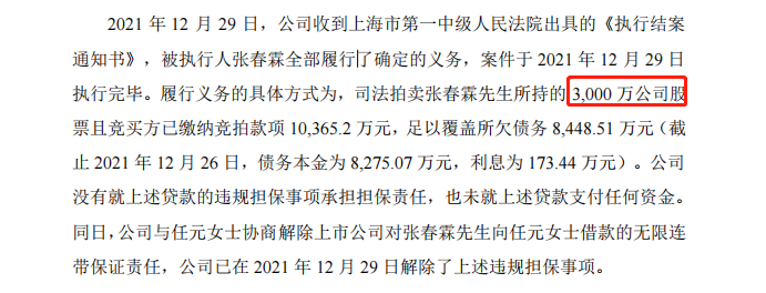 逼不得已之下,2020年7月,张春霖只好继续通过质押股权来借款,但也发生了上市公司违规担保事件。最终,从巴安水务2021年12月29日披露的信息看,张春霖以拍卖所持巴安水务3000万股股票等方式偿还了借款,并解除违规担保情形。