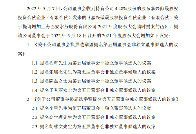 另一方面,在5月6日的董事会提名结果出炉后,嘉兴傲晟也迅速表达了不满,并于5月7日将其建议推荐的5名候选人以临时提案方式直接提交至股东大会审议,并最终在5月18日公司2021年年度股东大会上获得通过。