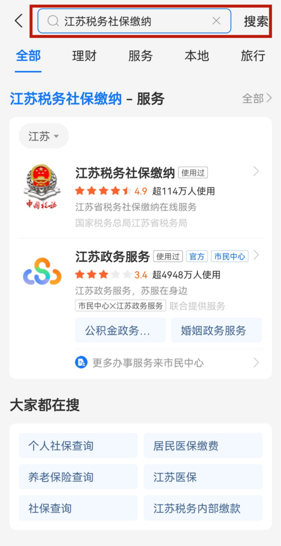 支付宝:支付宝首页搜索“江苏税务社保缴纳”,点击进入进行缴费操作。