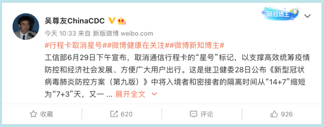 工信部6月29日下午宣布,取消通信行程卡的“星号”标记,以支撑高效统筹疫情防控和经济社会发展、方便广大用户出行。这是继卫健委28日公布《新型冠状病毒肺炎防控方案(第九版)》中将入境者和密接者的隔离时间从“14+7”缩短为“7+3”天,又一个新冠防控具体措施的优化调整。