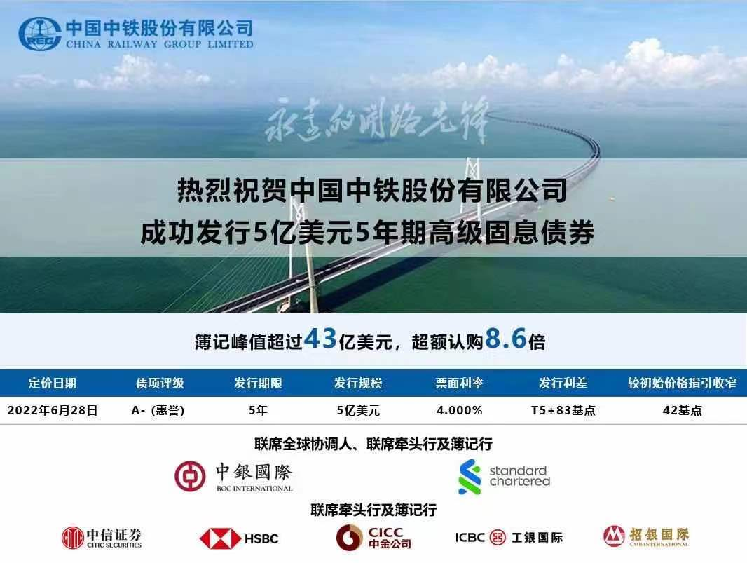 6月28日,中国中铁成功完成2022年5亿美元境外债券的发行定价工作。此次发债是中国经历疫情冲击并成功控制住疫情后首个央企发行境外债券,最终认购金额高达43亿美元,认购倍数将近9倍,定价为票面利率4%,较同期美国国债收益率仅上浮0.83%,利率低于二级市场交易价格0.20%。本次发行的债券成为今年以来同评级、同年期中资企业境外债投资者最多、订单量最大、超额认购倍数最大、利率最低的境外美元债券,最终利率大幅低于预期,相当于年节省财务费用100余万美元。
