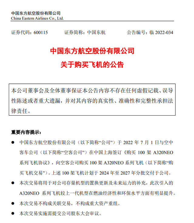 此外,中国东航也于7月1日发布公告,公司与空中公司在中国上海签订《购买100架A320NEO系列飞机协议》,向空客公司购买100架A320NEO系列飞机。