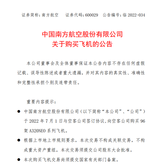 同日,南方航空发布公告称与空客公司签订协议,向空客公司购买96架A320NEO系列飞机,基本价格约为122.48亿美元(约为人民币818.94亿元)。