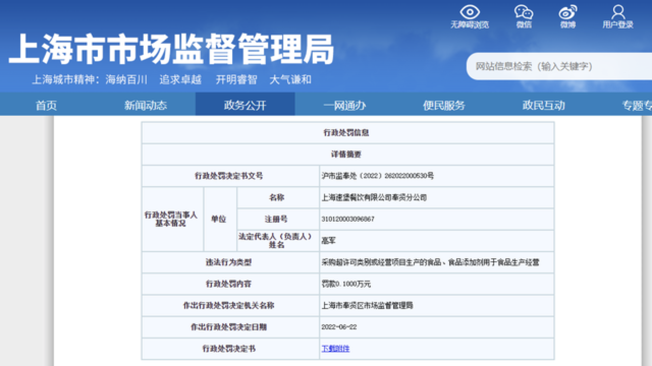 据新浪财经消息,近日,企查查APP显示,上海速堡餐饮有限公司奉贤分公司因违反《上海市食品安全条例》,被上海市奉贤区市场监督管理局罚款1000元。处罚事由显示,当事人经营店招为“外婆家”餐饮店,向未经许可从事生猪产品经营活动的上海频邦贸易有限公司采购仔排、杂排、带肉筒骨、猪脚、五花肉末,合计采购金额为1011.8元,经销售后违法所得2763.51 元。
