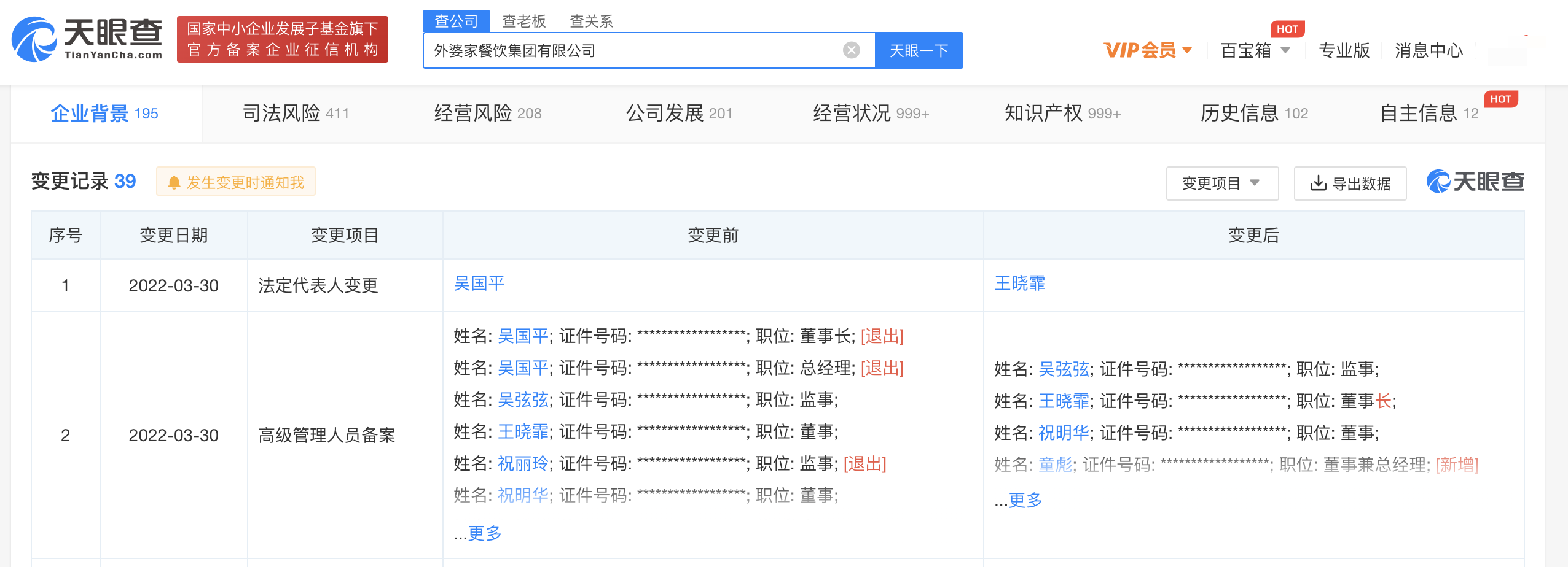 2022年3月,外婆家餐饮集团有限公司发生工商变更,创始人吴国平不再担任法定代表人及董事长,法定代表人由王晓霏接替。