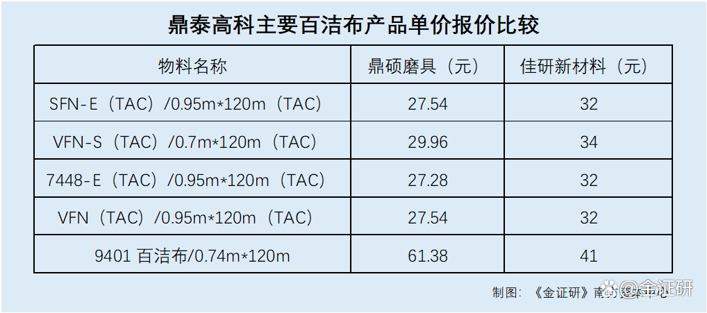 不难看出,除9401百洁布/0.74m*120m产品外,鼎泰高科向鼎硕磨具采购的其他百洁布产品单价,均低于佳研新材料对鼎泰高科同类产品的报价。
