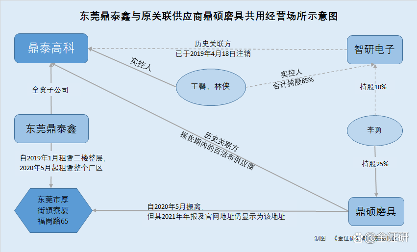 前文提及,鼎泰高科历史关联方鼎硕磨具系其供应商,且与其子公司东莞鼎泰鑫曾入驻同一处厂区,尽管鼎泰高科称两家公司在资产、人员、生产经营场所相互独立,而《金证研》南方资本中心研究发现,这两家公司或混淆经营。