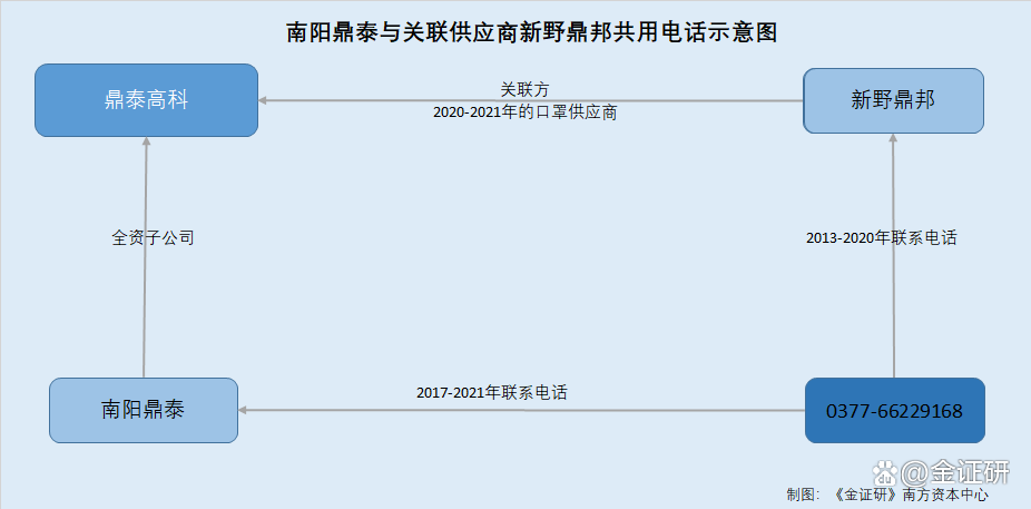 《金证研》南方资本中心研究发现,鼎泰高科称为避免同业竞争,收购了三位实控人控制的关联方的相关业务,却仍不“避嫌”,其全资子公司与该关联方共用联系方式,鼎泰高科的独立性缺失。