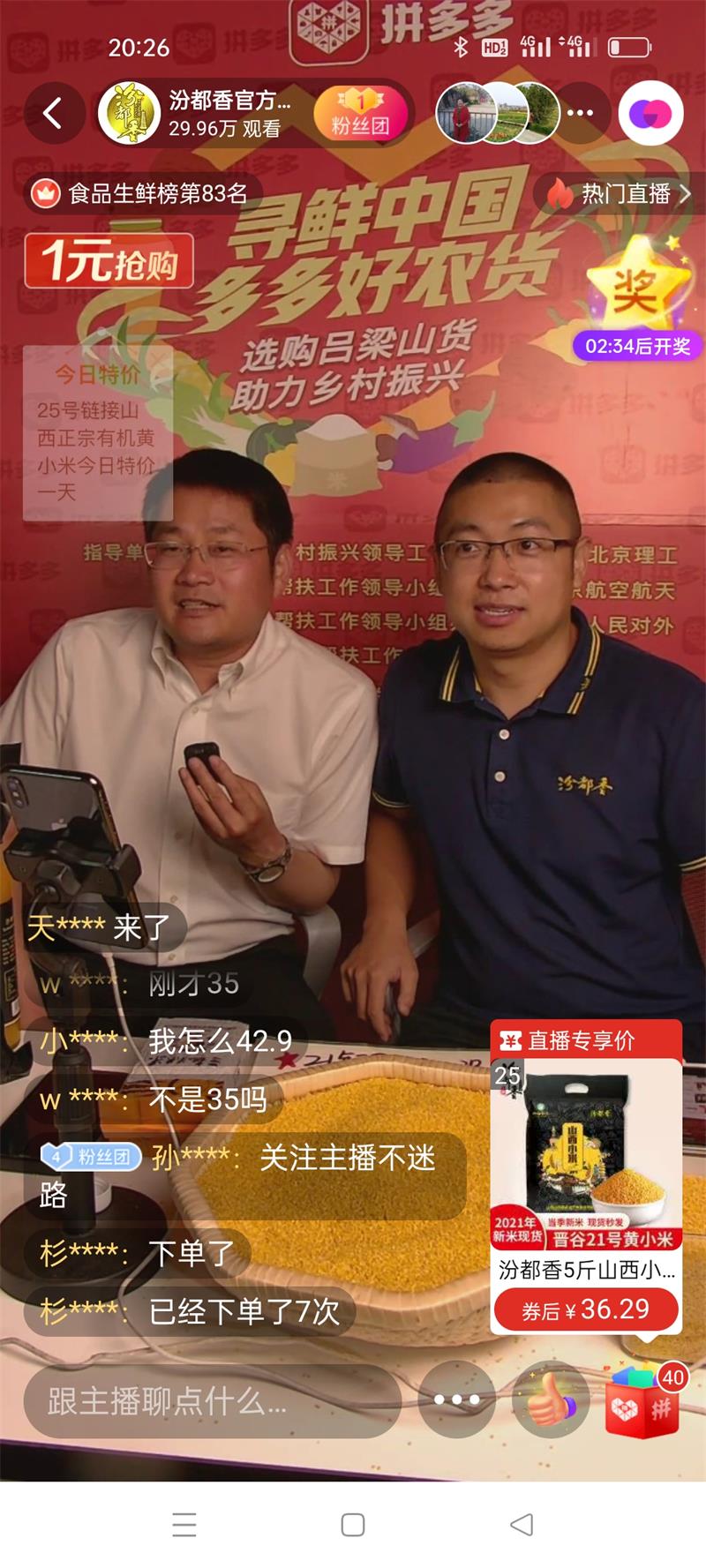 “活动当天共30个企业参加,有50多款产品。拼多多晓东优选,汾都香两大头部主播参加。拼多多专场直播到晚上10点,累计观看人数50多万。此外,还有部分企业自己直播。”相关负责人统计,当天直播间人气超百万,实实在在为吕梁山货打了一波名气牌。