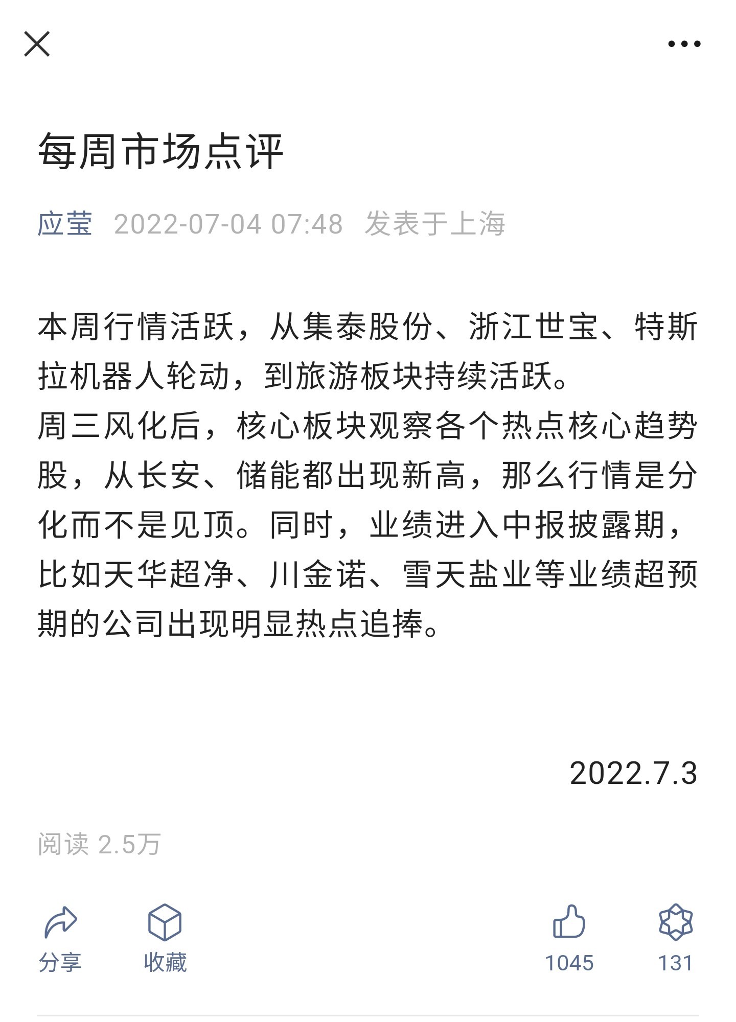 今日(7月4日),应莹在其个人公众号发布了《每周市场点评》,全文130字,对上周A股行情做了一轮复盘。内容发布后随即引发市场高关注度。