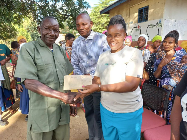 坦桑尼亚莫罗戈罗省助理行政秘书罗萨莉亚(右)给佩雅佩雅村“2022年度最佳大豆种植户”颁奖。(中国农业大学国际发展与全球农业学院供图)