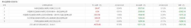 而买入的前五名则仅有4679万元,其中,素有“散户天团”之称的东财拉萨东环路第一证券营业部出现,散户投资者开始“接盘”。