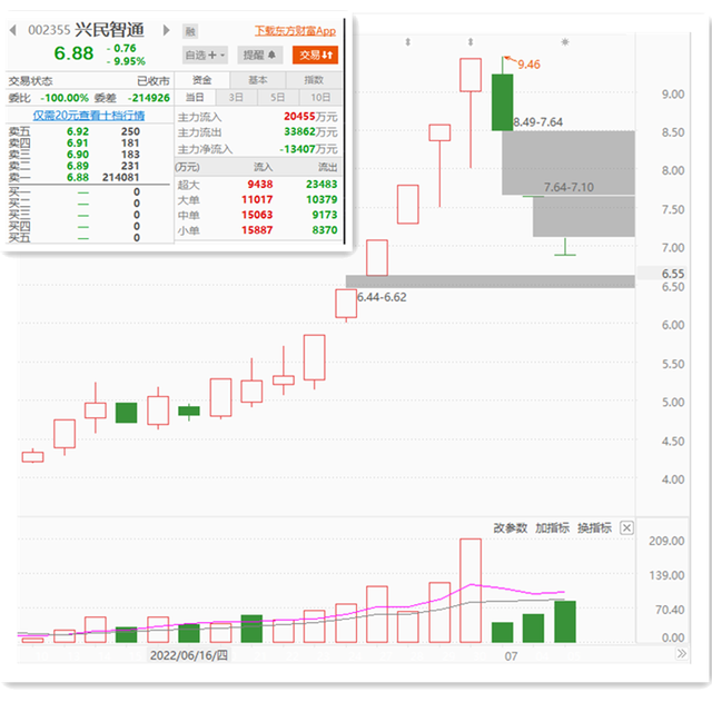6月23日开始,伴随汽车行业景气度上行,兴民智通连续6天封涨停板,6月30日放出天量。7月1日开盘创下9.46元新高后迅速跳水并跌停,截至今日收盘,兴民智通连续3日封死跌停盘,封单超20万手,股价报收6.88元,总市值42.7亿元。