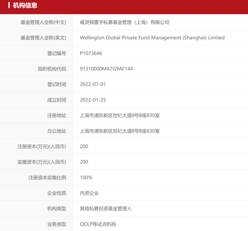 公开信息显示,这家名为威灵顿寰宇私募基金管理(上海)有限公司(以下简称威灵顿寰宇)的私募基金管理人,成立于今年1月,并在7月1日正式完成备案。注册资本200万元,注册地址位于上海市浦东新区,业务类型属于QDLP(合格境内有限合伙人)等试点机构。