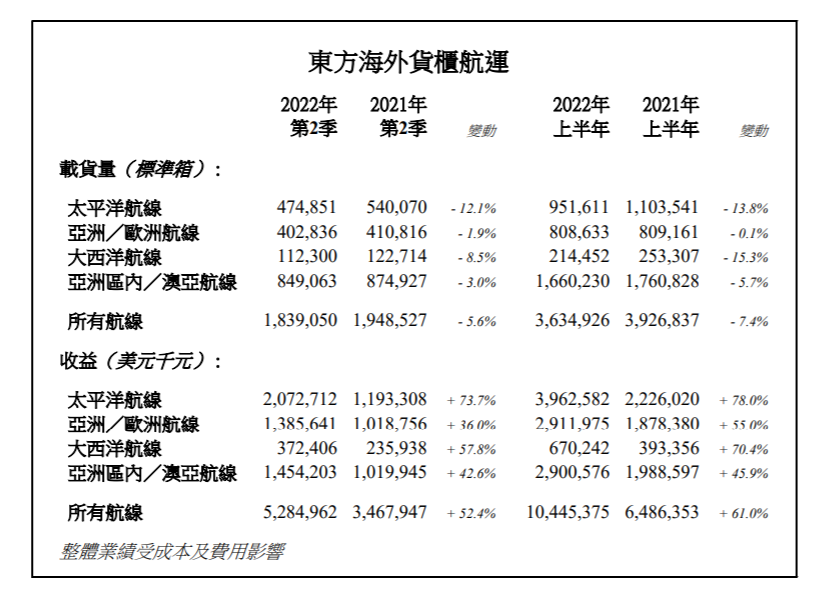 截至2022年6月30日止首6个月,东方海外国际的总收益录得61.0%升幅,总载货量较去年同期减少7.4%,运载力减少6.3%,整体运载率较2021年同期减少1.1%,而每个标准箱整体平均收益较去年同期增加74.0%。