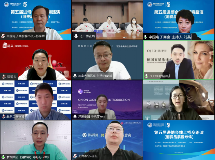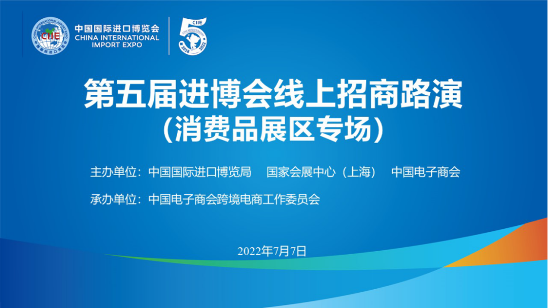 7月7日,第五届进博会线上招商路演(消费品展区专场)成功举办,本次活动由中国国际进口博览局、国家会展中心(上海)、中国电子商会共同主办。活动重点介绍了第五届进博会的整体情况及独特优势、专业观众注册及相关注意事项、消费品展区特色亮点等,并且将供需对接元素有机结合,安排展客商代表在线洽谈交流。这是第五届进博会严格落实疫情防控要求,进一步优化工作方式,为展客商搭建供需沟通渠道的创新举措,经过前两场路演活动的实践,已收获各方积极反馈。