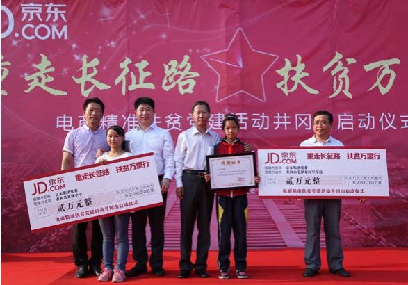 2016年9月27日,京东集团“重走长征路,扶贫万里行”电商精准扶贫党建活动在江西省井冈山市隆重启动,京东向井冈山当地学校捐赠款项及物资。