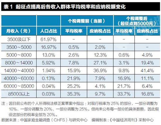 月收入在8000~14000元的这部分群体,在起征点提升至5000元时,对应的平均税率由现在的7.8%下降为3.1%,对应的收入增长率为5.1%;月收入在14000~40000元的这部分群体,在起征点提升至5000元时,对应的平均税率由现在的15.9%下降为9.8%,对应的收入增长率为7.3%。