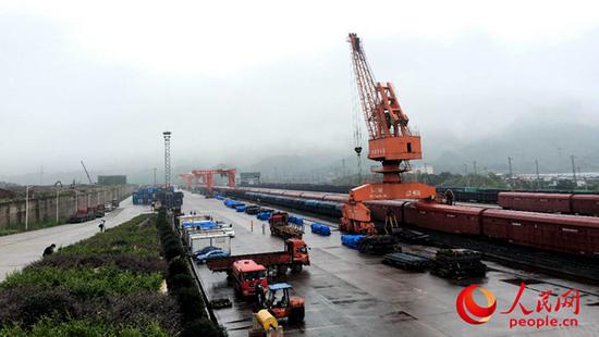 人民网重庆7月4日电 (孙阳)7月4日上午10时,重庆市两江新区果园港,一列果园港铁路专用线上的列车缓缓驶出,作为西部地区直联长江经济带和中欧班列(重庆)的水铁国际联运战略通道,这条2017年开启的专用线,真正成为“一带一路”与长江经济带的交汇点,助推重庆由内陆腹地变身开放前沿。