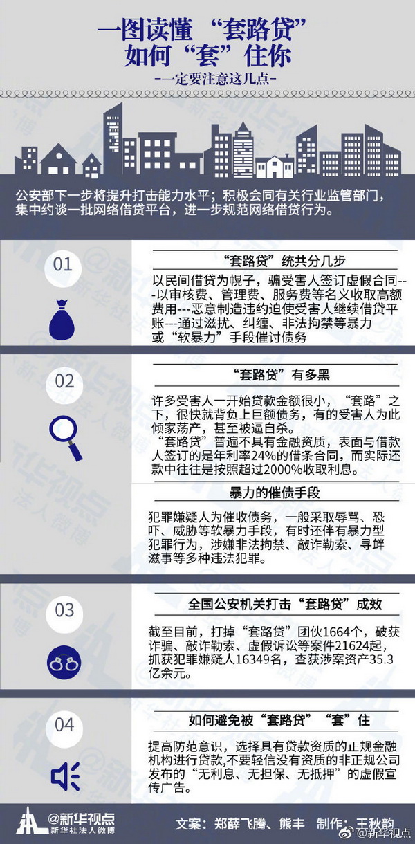 以民间借贷为幌子,骗取受害人签订虚假借款合同,以审核费、管理费、服务费等名义收取高额费用,恶意制造违约迫使受害人继续借贷平账,不断垒高债务,最后通过“软暴力”手段催讨债务……“套路贷”的“套路”有多深,如何让自己不被“套路”,转发提醒身边人!